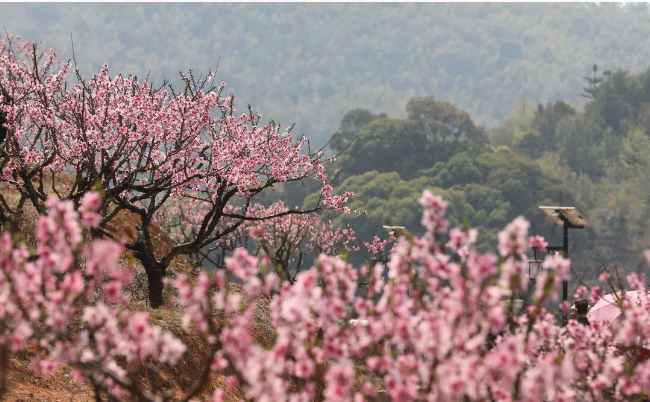 “快看!那里拍全景最美!”记者顺着一名游客手指的方向望去,桃园制高点的木质观景台“桃花台”上人头攒动。在此处俯瞰,层层叠叠的桃花如粉色海浪般漫过梯田,远处青瓦白墙的古村落点缀其间,宛如一幅水墨丹青图。而更动人的风景,却在山脚的花海深处——