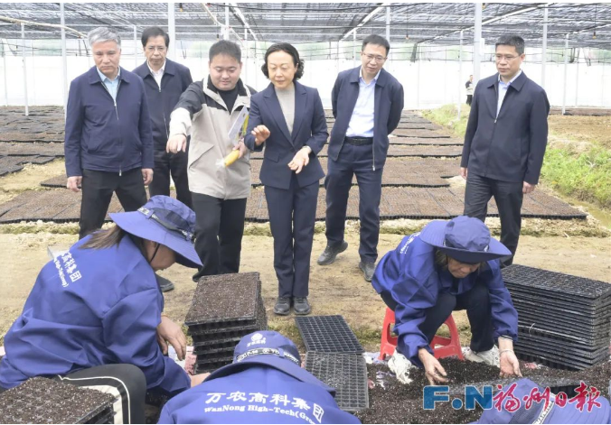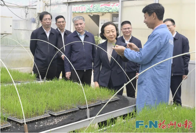 在盘谷乡丰园蔬菜育苗有限公司,郭宁宁察看抛秧苗工厂化育秧、机械化设备运用等,了解经营规模、市场供需以及需要解决的困难问题,勉励企业坚持源头抓品种、生产抓品质、市场抓品牌,以数字化赋能特色农业发展,不断丰富老百姓的“菜篮子”。