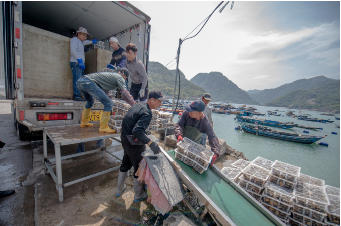 如今是鲍鱼收获季,春节每斤50元的高价已回落至31元,但日均30余车的外运需求仍让传送带昼夜不停。郑序溢算起丰收账:5000笼鲍鱼总产量约15万斤,扣除台风影响的两成产量,净利润超百万元。同时鲍鱼产业的溢出效应,正润泽整个渔村。