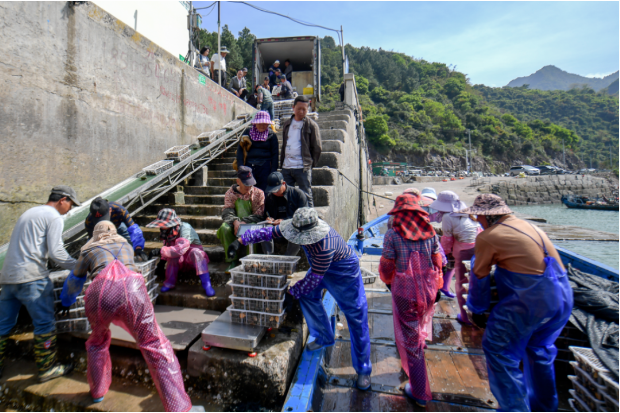 码头上这两条加起来不过40米的传送带,成了村民们的财富线。从传送带上装车的鲍鱼将被送往罗源和马尾两地的鲍鱼分拣厂,再被送往省内的各大商超市场和食品加工厂。
