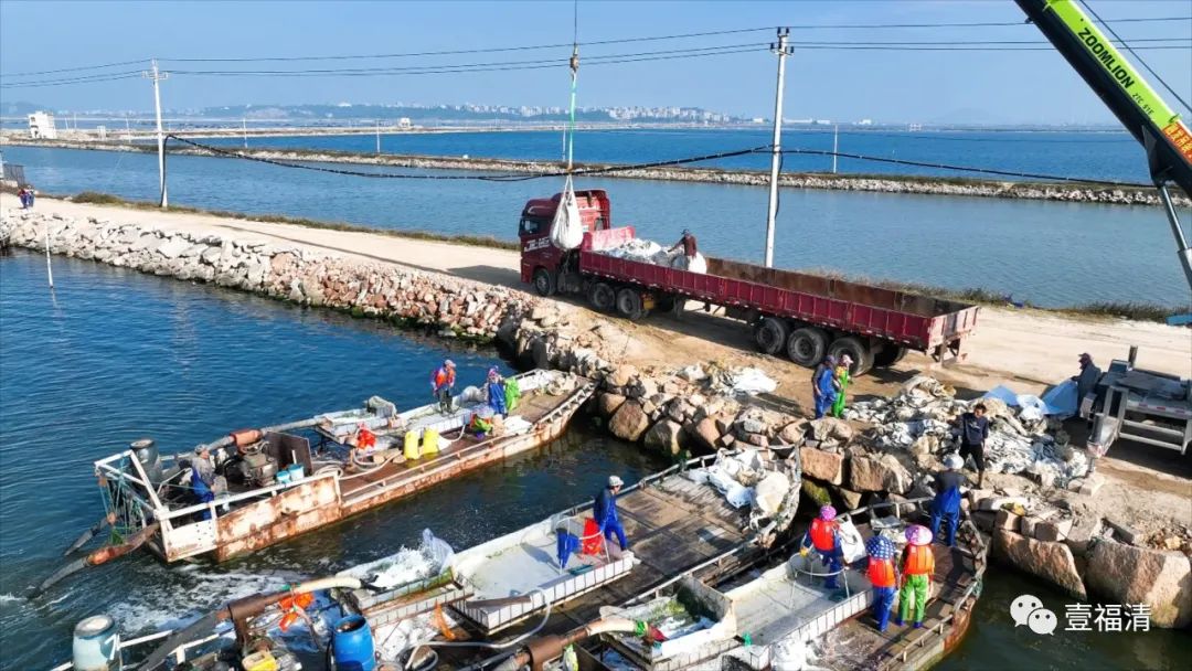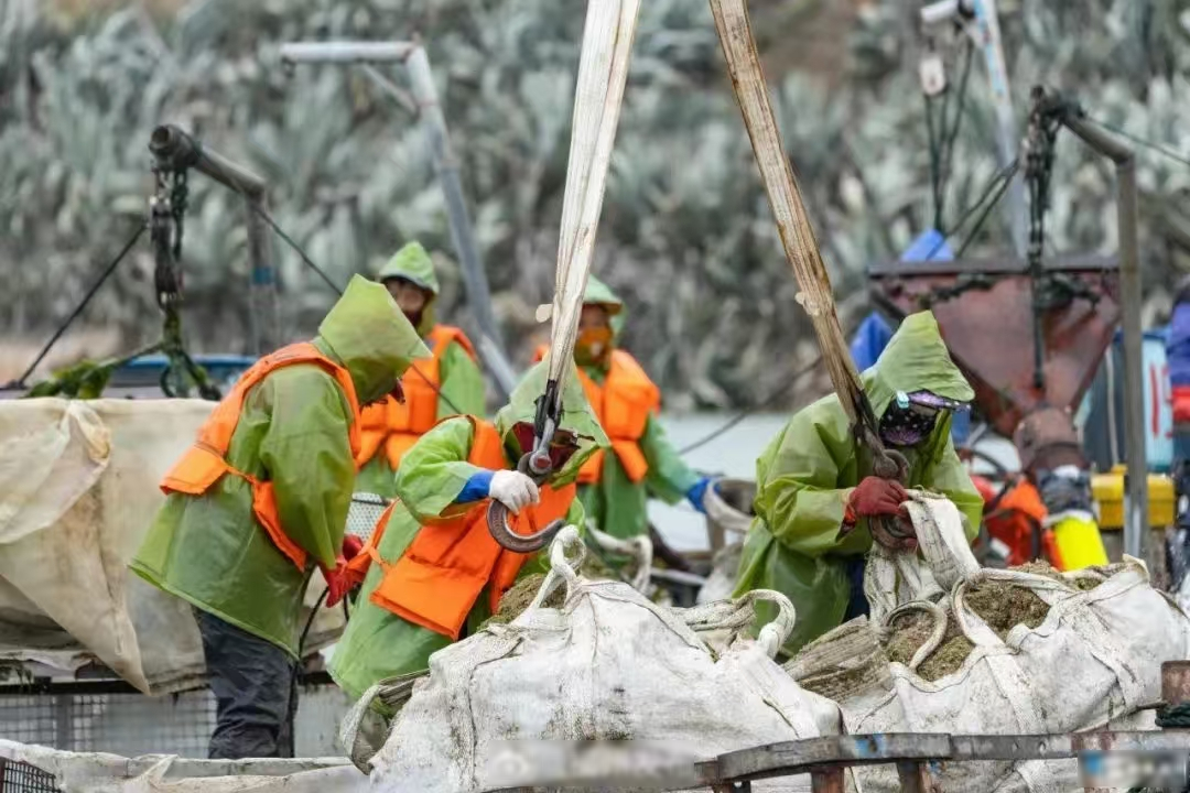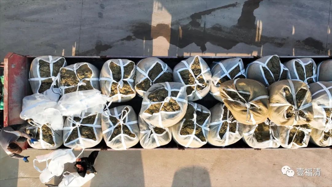 渔民们将沙苗混合物装袋运回码头。图源:壹福清