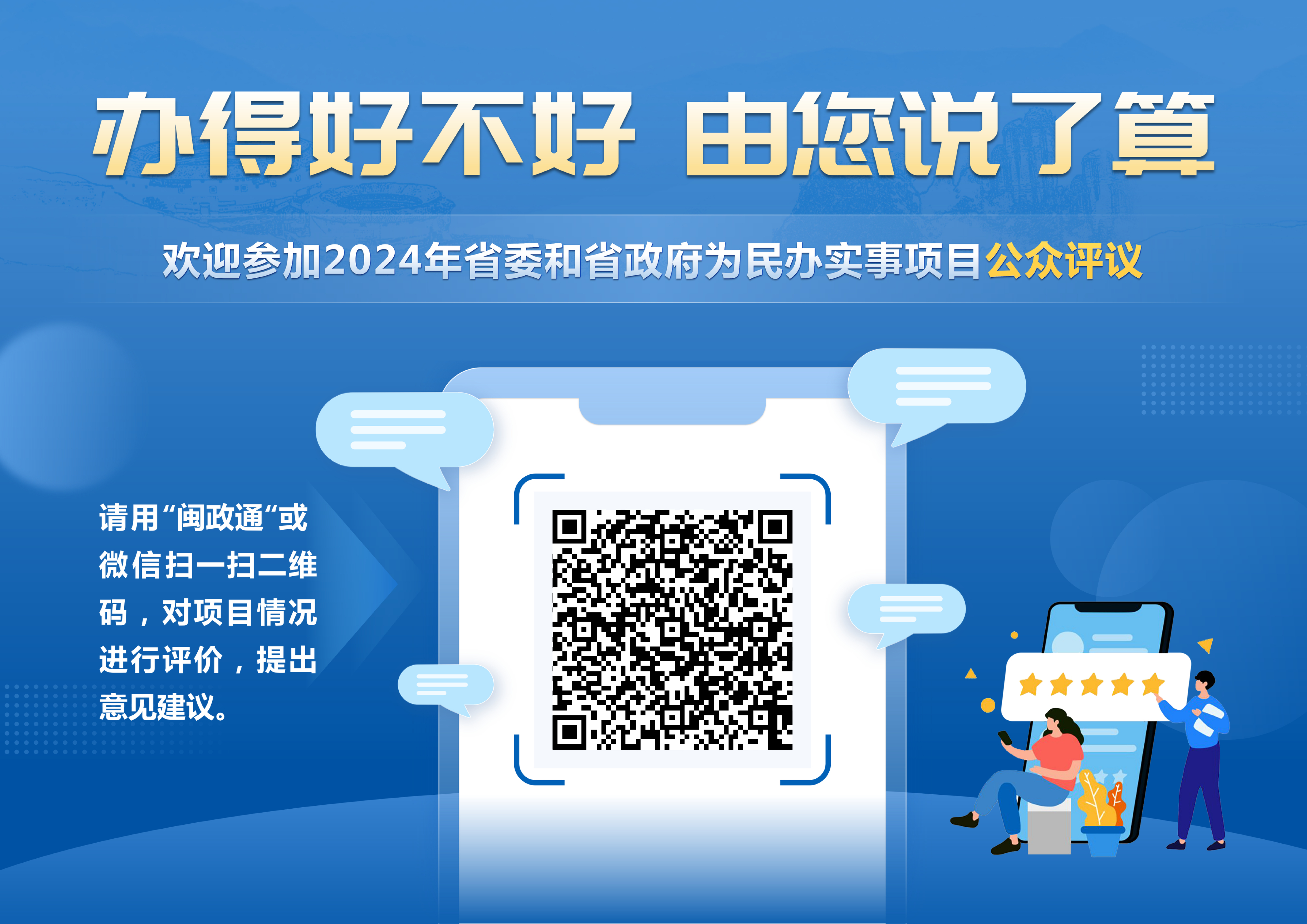 使用“闽政通”或者微信扫描海报上的“民生实事码”,即可对项目进行评议,也可通过省政府门户网站、“中国福建”微信公众号等进入活动页面参加评议。
