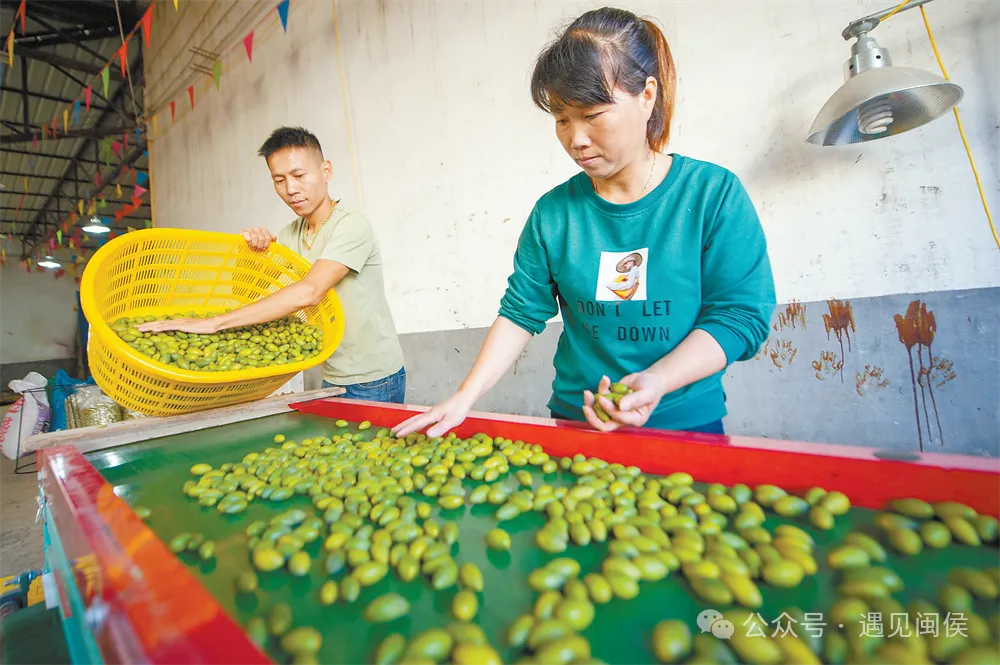 在位于闽侯的福州大世界橄榄有限公司,工人有序进行鲜果分拣、烘干、腌制、包装等生产作业。在这里,一颗颗橄榄经过不同的处理工艺,变身为橄榄汁、橄榄蜜饯等产品,身价提高了不少。