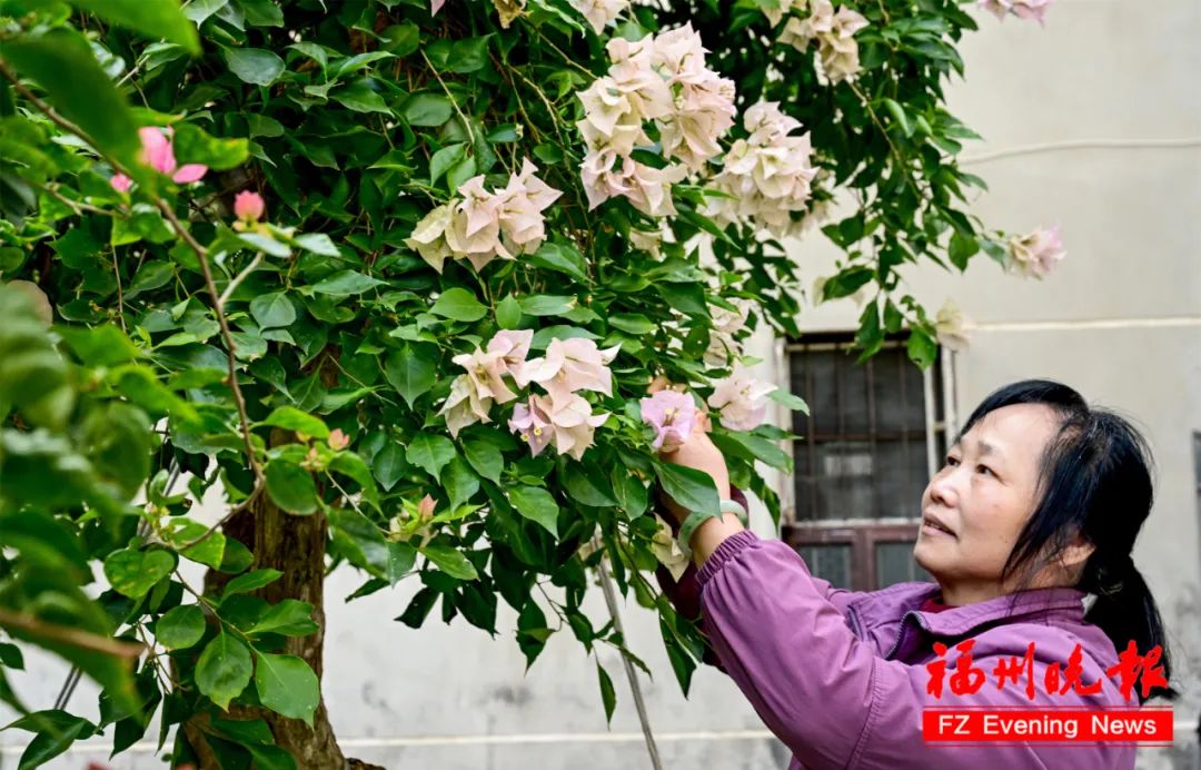 仓山镇霞湖村最美庭院内张美玉正在打理三角梅。