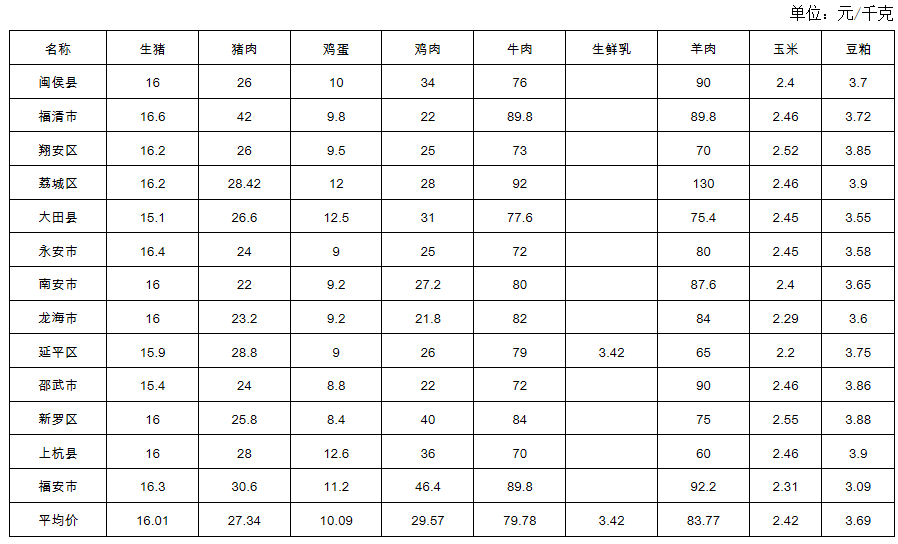 福建省2025年第10周畜产品及饲料集市价格周报