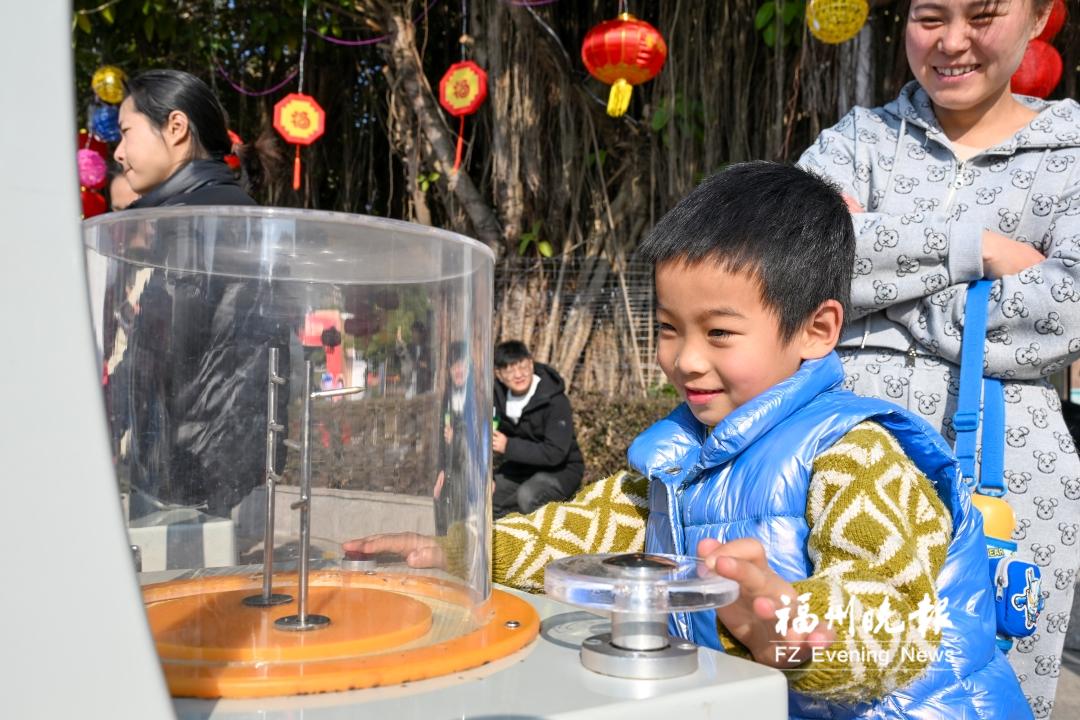 既有非遗文化大观园,也有科普大篷车。科技志愿者告诉记者,他们带来了“尖端放电”“魔镜”“无弦琴”等近20个体验项目,为小朋友们打造了一站式、沉浸式的科普展区。其中,会翻跟头、会拜年的机器狗,成了现场网红,受到小朋友追捧。
