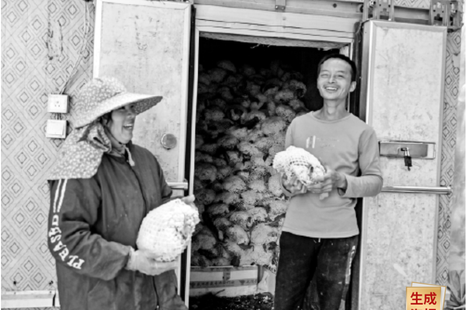 一边有种植,一边有销路。随着称重器上的数字亮起,一车圆滚滚的花菜被陆续搬进张春凤家的冷藏冰库。张春凤是新塘本地人,今年50岁,从事收菜工作20余年。“从事收菜工作前,我也是一个种植户。后来,村里种植业不断发展,收菜人的需求越来越大,于是我开始专门从事收菜工作。”张春凤说。